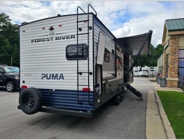 If you're looking for family-fun adventures, then you need one of these Forest River Puma travel trailers! They are built rugged, easy to tow, and jam packed with features. The Darco wrapped underbelly will help protect your unit, and the roof and side mount solar prep gives you the option to add off-grid power. Inside, the Congoleum linoleum will be easy to keep clean, and the night roller shades will provide privacy when it's time to turn in. You'll also enjoy an electric awning with an LED light strip plus an AM/FM/Bluetooth stereo and two outside speakers to keep the party going!
