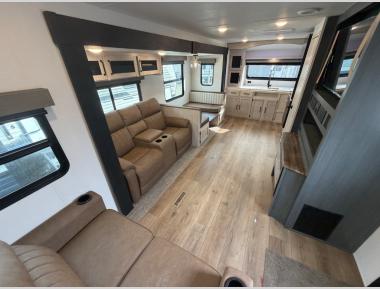 Sleeps 4 Slides 2 Length 37 ft 11 in Ext Width 8 ft Ext Height 11 ft 1 in Hitch Weight 1130 lbs GVWR 9930 lbs Dry Weight 8333 lbs Cargo Capacity 1597 lbs Fresh Water Capacity 43 gals Grey Water Capacity 65 gals Black Water Capacity 30 gals Furnace BTU 5100 btu Available Beds King Refrigerator Type 12V Black Glass Refrigerator Size 11 cu ft Shower Size 32" x 40" Number of Awnings 1 Water Heater Capacity 6 gal Water Heater Type Gas/Electric AC BTU 13500 btu Awning Info 21' Electric with LED Lights Axle Count 2 Washer/Dryer Available Yes Shower Type Shower w/Seat Electrical Service 50 amp Similar Travel Trailer Floorplans
