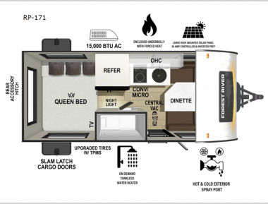 With any R-Pod travel trailer by Forest River, you will enjoy affordable luxury at the lowest tow weight in its class! There is a sealed underbelly with forced heat, a curved dual-pane acrylic front window with a bug screen and night shade, plus a large roof mounted solar panel for off-grid capabilities. The 15K A/C unit will keep you comfortable during the summer camping months, and the tankless water heater will provide endless hot showers after hiking, biking, swimming and more! Each model also includes a black glass friction hinge entrance door, roof ladder prep, exterior motion lighting, plus a hot and cold exterior spray port to wash off sand from the beach. Inside, you'll enjoy seamless Surf-X kitchen countertops, blackout roller shades, and a central vacuum system for hassle-free cleaning!