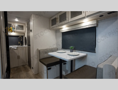 This travel trailer is the perfect couple's trailer with sleeping space for an overnight guest on the booth dinette. You will enjoy the front queen bed for a great night's rest, and there is a full bath on board to clean up each day. A two burner cooktop in the kitchen will let you cook meals inside instead of over a fire outside, and there is ample counter space to set out the meal. After dinner is cleaned up, head outdoors to relax under the 11' power awning!