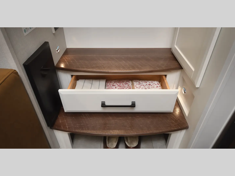 You will truly appreciate the stackable washer/dryer because it will allow you to travel without restraint, and the Truma Aqua Go Comfort on-demand hot water heater will give you hot water whenever you need it. You'll stay entertained with a Samsung LED Smart TV in the living room and a 40" LED TV in the bedroom, and the 200W solar panel will provide some off-grid capabilities.