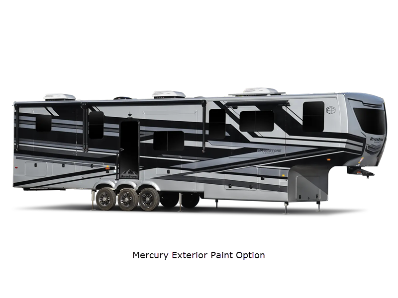 The Forest River RiverStone fifth wheels and toy haulers are super luxurious and convenient for all your camping or full-time needs! These elegant units have standard features that will enhance every aspect of your trip, like a cordless vacuum, 18-cubic foot French door refrigerator with an ice maker, an under-bed storage compartment, and hydraulic slide outs.