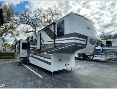 Sleeps 4 Slides 4 Length 44 ft 10 in Ext Width 8 ft 6 in Ext Height 13 ft 5 in Int Height 0 ft Hitch Weight 2900 lbs GVWR 23900 lbs Dry Weight 18971 lbs Cargo Capacity 4929 lbs Fresh Water Capacity 79 gals Grey Water Capacity 100 gals Black Water Capacity 100 gals Tire Size 17.5" Furnace BTU 40000 btu Available Beds King Refrigerator Type French Door with Ice Maker Refrigerator Size 18 cu ft Convection Cooking Yes Cooktop Burners 4 Axle Weight 8000 lbs LP Tank Capacity 40 lbs Water Heater Type Truma Aqua Go Comfort On Demand AC BTU 30000 btu TV Info LR Samsung LED Smart TV, BR 40" Smart LED TV Axle Count 2 Washer/Dryer Available Yes Number of LP Tanks 2 Shower Type Standard Electrical Service 50 amp Solar Wattage 200 watts Similar Fifth Wheel Floorplans