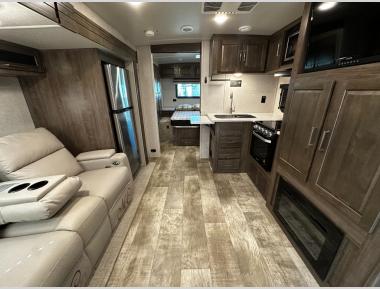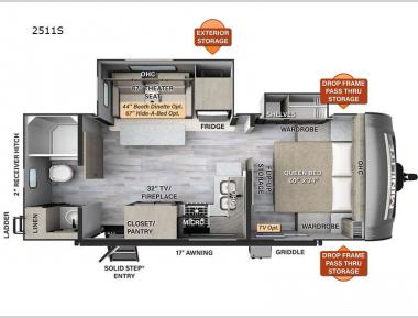 Camping trips to the lake just got sweeter with this dual slide out travel trailer in tow! Once you arrive, unload your gear from the exterior drop-frame pass-through storage, then start lunch on the exterior griddle. If you need a rest after traveling all day, the RV queen bed in the front bedroom is sure to give you comfort, or you can relax on the theater seating. The fireplace and entertainment center with a 32" TV will make this space feel just like home, and check out the spacious full rear bath for added privacy. This model also includes an entryway closet/pantry for jackets, shoes, and food!