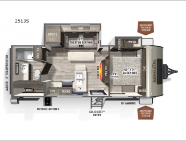 This is the perfect travel trailer for two people looking for comfortable camping trips! You will have your own RV queen bed to sleep on in the front private bedroom, and an optional TV can be added if you enjoy the morning news in bed. Breakfast can be made on the three burner cooktop, or head outdoors to cook on the outside kitchen. The theater seating with a table will provide a place to relax and dine together, and the spacious full rear bath will allow you to clean up before you head out for the day. This model includes plenty of storage space, including two pantries, a wardrobe slide out in the bedroom, plus a drop-frame pass-through storage for larger camp gear!