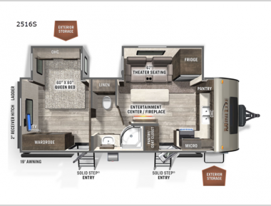 Escape the city life for weekend trips in this cozy couple's trailer. The dual entry doors will allow you to enter in through the rear private bedroom, or the front kitchen/main living area for convenience. You will enjoy relaxing on the theater seating across from the 32" TV and fireplace in the evenings, or you can visit outdoors under the 19' power awning. You'll also find an exterior griddle here for quick meals and exterior storage for the fishing poles or hiking gear. This model also includes a walk-through bath with a shower skylight, a linen closet, plus a Showermiser Water Saving System. And don't worry about storage space inside since this model includes an entryway pantry/closet, a second pantry in the front kitchen, plus a large bedroom wardrobe to keep your clothes wrinkle-free!