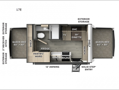 This expandable travel trailer is perfect for camping trips to your favorite park. You will find two queen tent end beds for cozy sleeping space plus a 39" booth dinette that will double as dining and additional sleeping space. There is also an entryway bench so you can easily pull your boots on for hiking. The three burner gas cooktop and microwave oven will let you make meals each day, and the 12V refrigerator will keep your food fresh. There is even a pantry/wardrobe that can store dry goods and clothes. Head outside to find Solid Step entry steps, a 2" receiver hitch, a 12' power awning with LED lights and exterior storage!