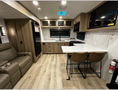 This front kitchen, couple's trailer is ready for adventure when you are! Once you arrive at your destination, prepare a quick lunch with the Griddle Prep, and enjoy the shade provided by the 19' power awning. You can eat outside, or inside at the counter with stools. The 67" theatre seat will make this travel trailer feel more like home, and the double slides provide more space to stretch out. Within the master bedroom you'll find a king bed, a large wardrobe and a dresser, plus an optional TV. And check out the full rear bath with dual bath sinks and a shower with a seat! Now, that's what I call comfort!