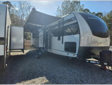 Whether you enjoy spending time outdoors or indoors, there is something for everyone in this travel trailer. The large pass-through storage can store your fishing poles, and the 20' electric awning with LED lights will create an outdoor living space. There is even an outdoor refrigerator with an outside storage cabinet and 32" TV! You will love all the interior space thanks to the dual opposing slides in the main living area, which will give the chef space to work around the kitchen island. Your crew can visit on the tri-fold sofa, theater seating and 5-person dinette while the fireplace is going, but you'll probably find the kids spending most of their time in the private bunkhouse! What more could you want in a travel trailer?!