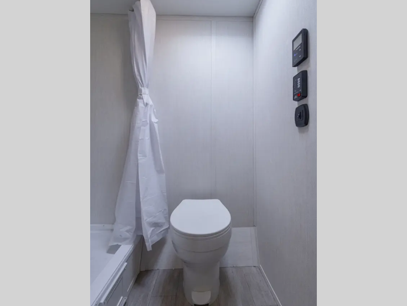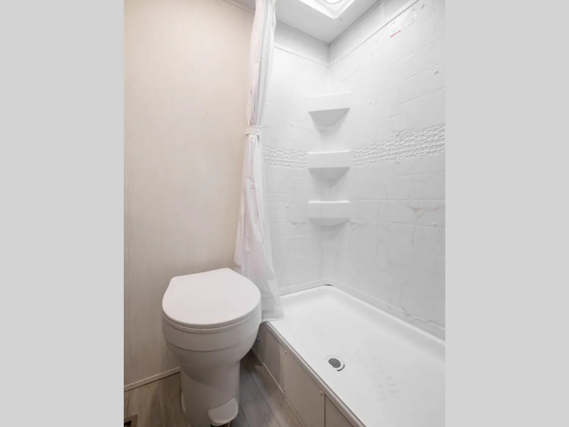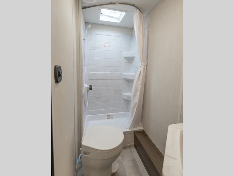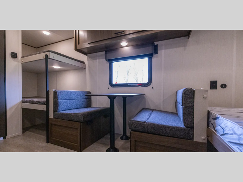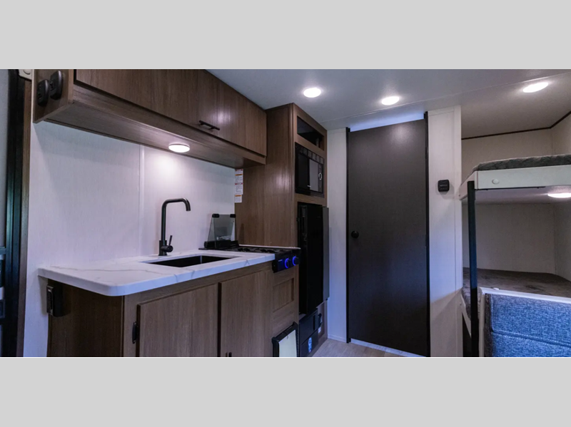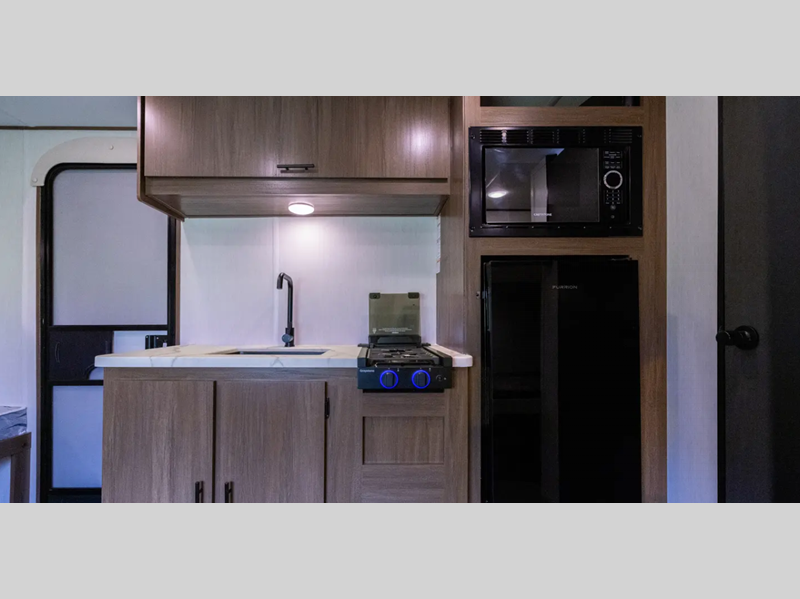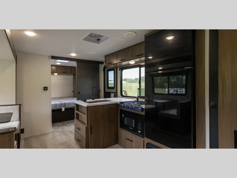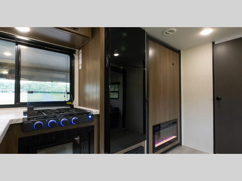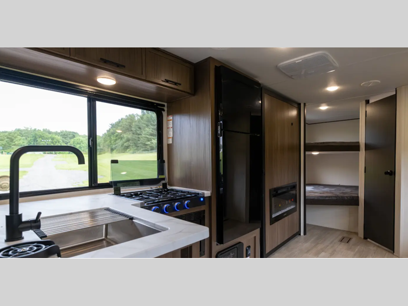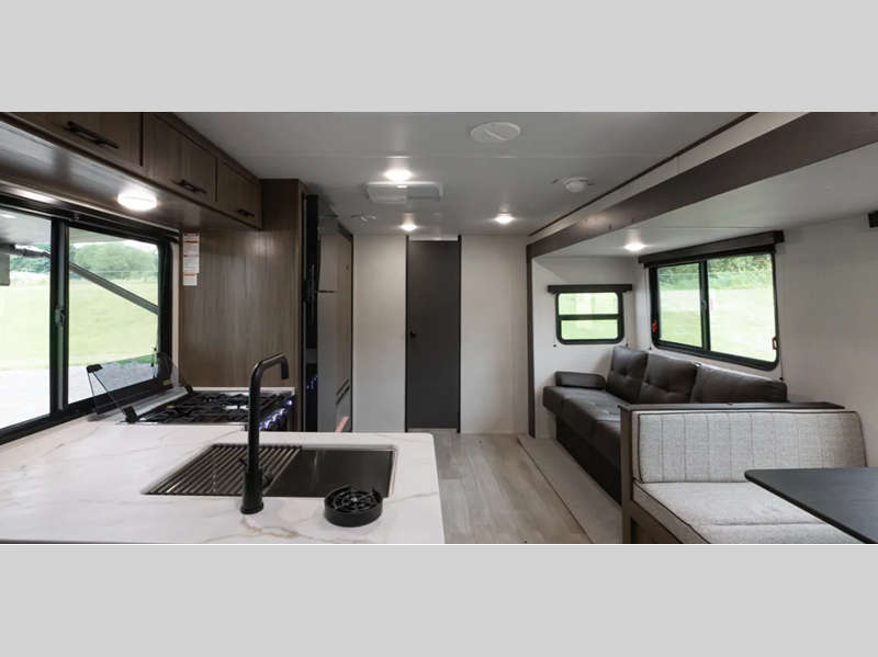 Inside, you'll love the high rise kitchen faucet, along with ample storage spaces, plus multiple 110V outlets and USB-C charge ports to stay powered up. You will also appreciate camping with a tankless water heater, a detachable electrical cord, plus an A/C and auto ignition furnace to keep you comfortable.