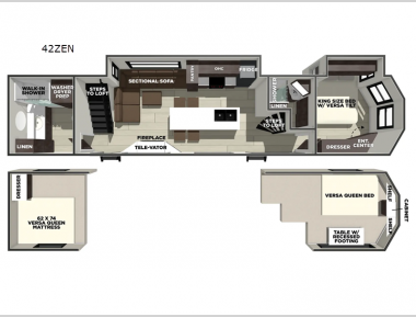 This thoughtfully designed 42ZEN model provides a blend of comfort and functionality. It features two lofts for added sleeping and living space, one includes a 62" x 74" Versa queen mattress and a dresser for storing clothes and essentials, while the second loft offers another Versa queen bed, plus a table with recessed footing, perfect for getting work or study done on the road. There is also a cabinet and shelf to keep everything organized. On the main floor, you'll find a large rear full bathroom, complete with a walk-in shower, linen closet, and washer/dryer prep, providing all the comforts of home. The main living area centers around a large sectional sofa with room for the whole crew, facing a fireplace and Televator TV, making it the perfect space to relax after a long day. The kitchen island also adds valuable prep space and also serves as a gathering spot with room for stools. Up front, the master bedroom features a king-size bed with Versa Tilt, a dresser, and its own private bathroom, offering convenience and privacy whenever you need it.