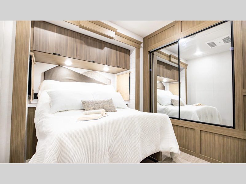 Sleeps 5 Slides 3 Length 43 ft 10 in Ext Width 8 ft Ext Height 12 ft 8 in Int Height 7 ft Hitch Weight 1475 lbs Dry Weight 11484 lbs Cargo Capacity 1991 lbs Fresh Water Capacity 40 gals Grey Water Capacity 70 gals Black Water Capacity 80 gals Available Beds Two Queen Beds with Versa Tilt Cooktop Burners 3 Number of Awnings 1 Water Heater Type Tankless AC BTU 15000 btu Awning Info 21' with 4K Blade Lighting Axle Count 2 Shower Type Radius Similar Floorplans