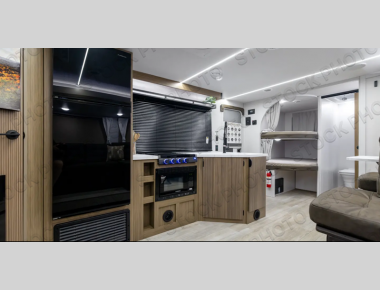 You're sure to make camping memories in this spacious travel trailer! You can easily sleep eight people each night thanks to the double-size bunks, the custom king bed with Versa Tilt in the front bedroom plus the Versa-Lounge within the large slide out! The full kitchen will let you make meals each day, and you'll appreciate the hidden pantry with shelves behind the fireplace. There is also a booth dinette where you can dine together or play a game of cards after dinner is cleaned up, or you may just find yourselves outdoors under the 16' awning. And don't overlook the full bath, complete with a tub/shower that will make bath time easier if you have little ones.