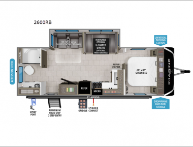Experience the ultimate in comfort and convenience with this luxurious travel trailer. When you enter this trailer, you'll find convenient shoe storage to your right below the wardrobe/pantry. The full rear bathroom has a 30" x 36" shower with skylight for you to rinse off after you come in from an afternoon hike, and you can lounge on the tri-fold sofa or U-shaped dinette with removable ottoman after you are clean. The large slide creates more interior space, so you can cook freely on the three-burner range with oven in the kitchen, also, you can cook on the outside griddle. You'll have a private bedroom that you can retreat to at the end of a long day, and the 60" x 80" queen bed will provide comfort while you sleep.Just imagine leaving the world behind and secluding yourself away with your favorite people in your Grand Design Imagine travel trailer! The Imagine has been designed to enjoy camping and includes a high-capacity furnace, a heated and enclosed underbelly with suspended tanks, a designated heat duct to the subfloor, and a high-density roof insulation with attic vent. You'll have a large panoramic window to let natural lighting in and an adjustable Power Awning with LED Lights for those night gatherings. The exclusive drop-frame pass-through storage compartment is going to allow you to bring along lots of equipment, and the universal docking station is an all-in-one location for utilities and hook-ups. You'll also have oversized tank capacities so that you can fill and empty your tanks less often.We have 22 2600RB availableView InventorySpecifications