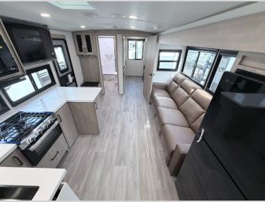 At the front of this 2810BH travel trailer, you’ll find a spacious full bedroom featuring a 60" x 80" queen bed, perfect for resting in comfort after a long day, along with dual wardrobes on each side to store your clothes and essentials. For added convenience, one of the two entry doors is located directly in the bedroom. Moving toward the center, the living area and kitchen create a welcoming space to relax and dine. The slide-out houses a quad theater seat, offering plenty of room to lounge, as well as a 10-cu. ft. refrigerator to keep your groceries fresh. Across from it, the U-shaped kitchen comes fully equipped with everything you need to cook comfortably, including a stainless-steel sink, three-burner range with oven, microwave, and solid surface countertops for meal prep. A bar top with stools provides a cozy dining spot, while a pull-out pantry keeps snacks organized. At the rear, the corner bathroom includes a 30" x 36" residential walk-in shower with skylight and a mirrored medicine cabinet, so you can skip the campsite facilities. Adjacent to it, the bunkhouse accommodates guests with a 36" flip-top bunk, tri-fold sofa, and even a flip-up desk, perfect for studying or remote work while on the road.