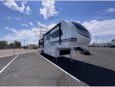 Sleeps 4 Slides 3 Length 34 ft 4 in Ext Width 8 ft 5 in Ext Height 13 ft 5 in Int Height 8 ft 5 in Hitch Weight 2400 lbs GVWR 18000 lbs Dry Weight 12100 lbs Fresh Water Capacity 81 gals Grey Water Capacity 106 gals Black Water Capacity 53 gals Tire Size ST215/75R 17.5 LRH Furnace BTU 35000 btu Available Beds Queen Refrigerator Type 12 Volt Refrigerator Size 16 cu ft Cooktop Burners 3 Shower Size 48" x 30" Number of Awnings 2 Axle Weight 7000 lbs LP Tank Capacity 30 lbs Water Heater Type Tankless AC BTU 15000 btu TV Info LR 40" LED Smart TV, BR LED TV Awning Info 11' and 16' Power w/Integrated LED Lighting Axle Count 2 Washer/Dryer Available Yes Number of LP Tanks 2 Shower Type Standard Electrical Service 50 amp Solar Wattage 330 watts Similar Fifth Wheel Floorplans