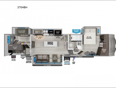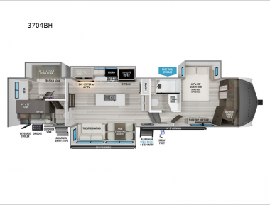 Sleeps 6 Slides 4 Length 40 ft 4 in Ext Width 8 ft 5 in Ext Height 13 ft 5 in Int Height 8 ft 5 in Hitch Weight 2728 lbs GVWR 16800 lbs Dry Weight 14798 lbs Fresh Water Capacity 81 gals Grey Water Capacity 106 gals Black Water Capacity 106 gals Tire Size ST215/75R17.5 LRH Furnace BTU 35000 btu Number Of Bunks 2 Available Beds Queen Refrigerator Type 12 Volt Refrigerator Size 16 cu ft Cooktop Burners 3 Shower Size 48" x 30" Number of Awnings 2 Axle Weight 7000 lbs LP Tank Capacity 30 Water Heater Type Tankless AC BTU 15000 btu TV Info LR 40" LED Smart TV, BR LED TV Awning Info 14' 5" & 10' 4"Power w/LED Lighting Axle Count 2 Washer/Dryer Available Yes Number of LP Tanks 2 Shower Type Standard Electrical Service 50 amp Solar Wattage 330 watts Similar Fifth Wheel Floorplans