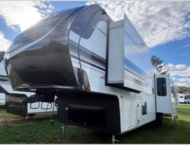 Sleeps 7 Slides 4 Length 42 ft 6 in Ext Width 8 ft 5 in Ext Height 13 ft 5 in Int Height 8 ft 5 in Hitch Weight 2911 lbs GVWR 19000 lbs Dry Weight 14603 lbs Fresh Water Capacity 83 gals Grey Water Capacity 106 gals Black Water Capacity 106 gals Tire Size ST215/75R17.5 LRH Furnace BTU 35000 btu Available Beds Queen, Folding Queen Refrigerator Type 12 Volt Refrigerator Size 16 cu ft Cooktop Burners 3 Shower Size 30" x 48", 30" x 36" Number of Awnings 2 Axle Weight 7000 lbs LP Tank Capacity 30 Water Heater Type Tankless AC BTU 30000 btu TV Info LR 50" LED Smart TV, BR 32" LED TVs Awning Info 11' and 15' 5" Power w/LED Lighting Axle Count 2 Washer/Dryer Available Yes Number of LP Tanks 2 Shower Type Standard Electrical Service 50 amp Solar Wattage 330 watts Similar Fifth Wheel Floorplans