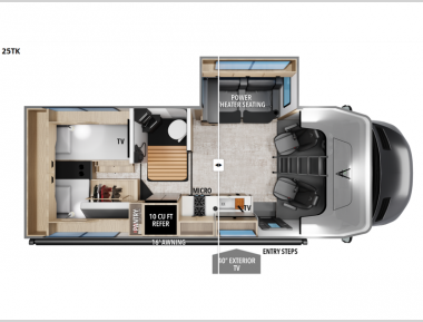 Sleeps 3 Slides 1 Length 25 ft 8 in Ext Width 7 ft 11 in Ext Height 11 ft 5 in Int Height 6 ft 8 in GVWR 12125 lbs Fresh Water Capacity 36 gals Grey Water Capacity 30 gals Black Water Capacity 30 gals Tire Size LT215/85 R16DRW Furnace BTU 20000 btu Generator 3.6kW Onan Fuel Type Diesel Engine Twin Turbo 2.0L Inline 4 Cylinder Chassis Mercedes-Benz Sprinter 4500 Horsepower 208 hp Fuel Capacity 24.5 gals Wheelbase 170 in Number Of Bunks 1 Available Beds King Torque 332 ft-lb Refrigerator Type 12V Refrigerator Size 10 cu ft Shower Size 24" x 34" Number of Awnings 1 Axle Weight Front 4630 lbs Axle Weight Rear 7934 lbs LP Tank Capacity 20.30 lbs. Water Heater Type Tankless AC BTU 15000 btu TV Info LR 32" 12V LED Smart TV, BR 32" 12V LED Smart TV Awning Info 16' Gross Combined Weight 15249 lbs Shower Type Standard Similar Motor Home Class C - Diesel Floorplans