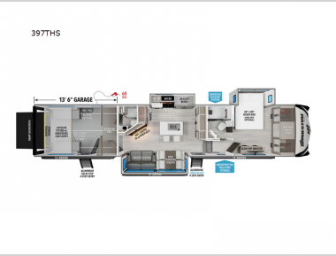 Experience year-round adventure with the Grand Design Momentum 397THS, featuring a spacious 13' 6" separate garage and luxurious dual full baths for ultimate comfort on the road!