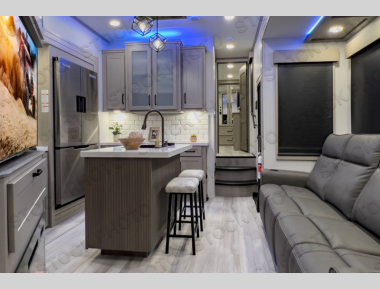 Traveling with friends and family can be comfortable when you have a full double entry bathroom and a half bath available when camping and enjoying the trails on your off-road toys! You will have an 15' garage space that can become a second living/dining area as well. There is an overhead loft bed and a four-seat sofa slide for more sleeping space in the main living area. Everyone can watch the LED TV when waiting for dinner and enjoy the fireplace on those chiller nights. The kitchen island offers a sink to wash dishes, extra counter space for serving meals and two stools to dine at. The cook will love all the upgraded appliances and the space thanks to the slide. The front bedroom gives you a queen bed slide with a king bed option, lots of clothing space, and a slide top dresser for even more storage.