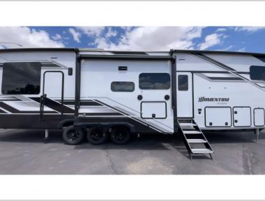 The Momentum fifth wheel toy haulers by Grand Design are built for four seasons of travel with your off-road toys and include luxurious accommodations throughout for extreme living! Each is constructed to a superior standard with the thermal roof design, the full-laminated walls, and the triple insulated garage floor. The MORryde CRE3000 suspension system and rubber pin box, plus the upgraded axle hangers provide the performance and smooth towing you desire, while the interior offers luxury such as color changing LED accent lighting, raised panel hardwood cabinet doors with hidden hinges, and a central vacuum system. Each toy hauler also includes four packages, including the Garage Package with Tuff-Ply gas and oil resistant flooring, the Weather-Tek Package with a Stealth AC System, and the Interior Luxury Package with solid surface countertops!