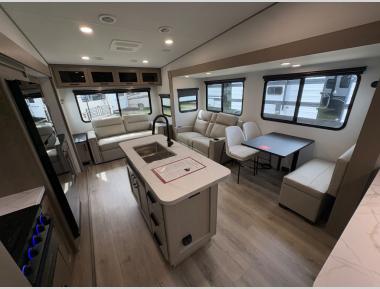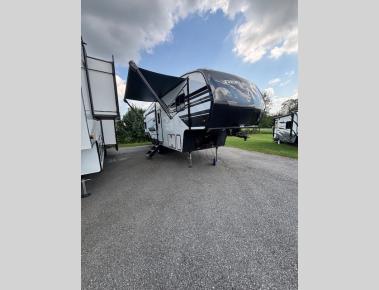 You'll love the amount of space you have in this fifth wheel thanks to the dual opposing slides in the rear living area/kitchen. Your friends and family can relax on the tri-fold sofa or theater seating across from the high-definition 40" LED TV. There is also a booth dinette or you can choose the optional swivel dinette if you prefer that seating. The chef of your group will appreciate having a kitchen island that will provide more counter space, plus there is a hutch with overhead cabinets for nice dishes. A full bath onboard lets you clean up each day and the front private bedroom includes a queen bed just like at home. You'll also love spending time outdoors under the electric awning, and there is an unobstructed pass-thru storage for fishing poles, hiking gear, and camp chairs!