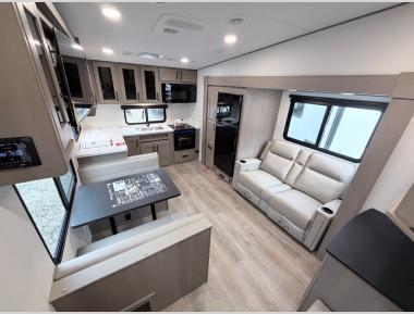 At the front of this fifth wheel, a private bedroom offers a walk-around 60" x 80" queen bed for restful comfort, complemented by dual wardrobes for convenient clothing storage. Down the hall, the full bathroom includes a 30" x 36" residential walk-in shower, a large, mirrored medicine cabinet, and linen storage for towels and toiletries. The middle living area features a cozy fireplace and booth dinette with a TV above perfect for dining while enjoying your favorite shows. Opposite, a slide-out holds the 62" theater seating for relaxing after a day of adventure, alongside a 10-cu. ft. refrigerator and pantry for all your groceries and dry goods. At the rear, an L-shaped kitchen provides generous counter space, a deep-seated stainless-steel sink, and a 30" microwave, allowing you to prepare meals comfortably without relying on campground facilities.