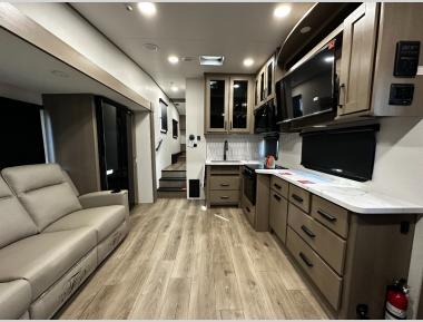 With any Reflection 150 Series fifth wheel by Grand Design, there is more available payload capacity and a broader range of half-ton trucks capable of towing this fifth wheel, and no slider hitch is needed thanks to the 90-degree turning radius which makes them short bed friendly and easier to tow. The mandatory Ultimate Power package provides a "One-Touch" automatic leveling system and a detachable power cord with LED light for easy setup, plus motion sensor pass-through lighting and entry lighting, and the Tire Linc TPMS will help you stay safe on the road. The interior offers residential cabinetry and premium Congoleum flooring, to the booth dinette and residential-style window treatment. Make your refined decision today!