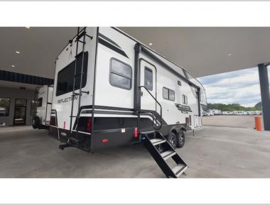 Feel right at home in this Reflection 150 Series with a private bedroom that includes a walk-around queen bed with storage on each side, windows, and a space savings sliding door. The full bathroom offers a walk-in shower, storage for your linens and a sliding door for easy access. When you get hungry, the cook will have an L-shaped kitchen area to make meals, plus full amenities including a 30" microwave, a flip-up counter extension, a pantry for your dry goods and a 16 cu. ft. refrigerator to store lots of food and cold beverages. You can dine at the rear U-shaped dinette lounge and enjoy the view out of all the windows or outside under the 18' electric awning. And the 78" theatre seating will be a nice place to relax and watch the 40" LED HDTV.