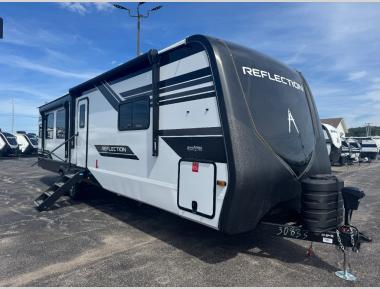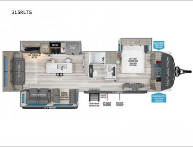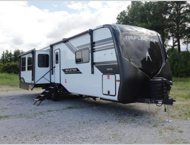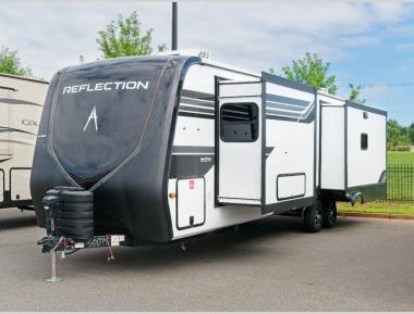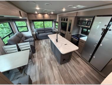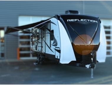 Experience ultimate comfort on the road with the Grand Design Reflection 345RLTS, featuring a spacious kitchen island and dual power awnings for effortless indoor and outdoor living.