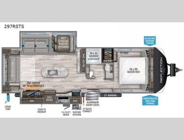 Enjoy the perfect blend of comfort and convenience with the Grand Design Reflection 297RSTS, featuring a gourmet kitchen with island and outdoor cooking space plus a spacious rear living area with theater seating and a cozy fireplace.