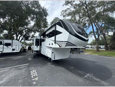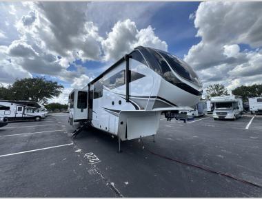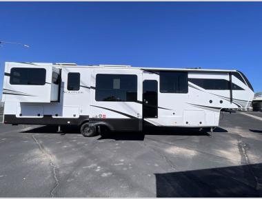 Sleeps 6 Slides 5 Length 42 ft 5 in Ext Width 8 ft 6 in Ext Height 13 ft 5 in Exterior Color Standard Graphics or Aurora, Midnight, Pearl Full-Body Paint Options Hitch Weight 3050 lbs GVWR 19000 lbs Dry Weight 15180 lbs Fresh Water Capacity 81 gals Grey Water Capacity 106 gals Black Water Capacity 53 gals Tire Size ST215/75R 17.5 LRH Furnace BTU 35000 btu Available Beds Queen Refrigerator Type 12V Refrigerator Size 20 cu ft Cooktop Burners 4 Shower Size 48" x 30" Number of Awnings 1 Axle Weight 8000 lbs LP Tank Capacity 30 lbs. Water Heater Type Tankless On Demand AC BTU 30000 btu TV Info LR LED Smart TV Awning Info 16' Power w/Integrated Lighting Axle Count 2 Washer/Dryer Available Yes Number of LP Tanks 2 Shower Type Shower w/Seat Electrical Service 50 amp Similar Fifth Wheel Floorplans