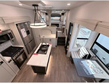 This Unit Includes $39,070 in Options Featuring a Kitchen Island; Pantry; Hutch; Stainless Steel Appliances; Fireplace; Dual Tri-Fold Sofas; Full AND Half Bath; Heated Pass-Through Storage with Sliding Tray; MORryde Suspension System and More!