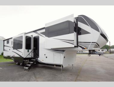 Sleeps 6 Slides 5 Length 41 ft 4 in Ext Width 8 ft 5 in Ext Height 13 ft 5 in Int Height 8 ft 1 in Exterior Color Standard Graphics or Aurora, Midnight, Pearl Full-Body Paint Options Hitch Weight 3052 lbs GVWR 19000 lbs Dry Weight 14866 lbs Fresh Water Capacity 81 gals Grey Water Capacity 106 gals Black Water Capacity 106 gals Tire Size ST215/75R 17.5 LRH Furnace BTU 35000 btu Available Beds Queen Refrigerator Type 12V Refrigerator Size 20 cu ft Cooktop Burners 4 Shower Size 48" x 30" Number of Awnings 2 Axle Weight 8000 lbs LP Tank Capacity 30 lbs. Water Heater Type Tankless On Demand AC BTU 30000 btu TV Info LR LED Smart TV Awning Info 14' 5" and 15' 5" Power w/Integrated LED Lighting Axle Count 2 Washer/Dryer Available Yes Number of LP Tanks 2 Shower Type Shower w/Seat Electrical Service 50 amp Similar Fifth Wheel Floorplans