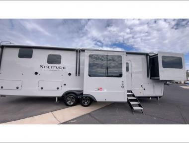 Each Solitude fifth wheel by Grand Design features a 101" wide-body construction, heavy duty 8,000 lb. axles, frameless tinted windows, and high-gloss gel coat sidewalls. You can camp year around thanks to the Weather-Tek Package that includes a 35K BTU high-capacity furnace, an all-in-one enclosed and heated utility center, and a fully enclosed underbelly with heated tanks and storage. Inside, you'll love the premium roller shades, hardwood cabinet doors, solid surface countertops, plus residential finishes throughout to make you truly feel at home. Each model also includes a MORryde CRE3000 suspension system, self adjusting brakes, and a MORryde pin box that will provide smooth towing from home to campground. Affordable luxury is possible with the Solitude fifth wheels; choose yours today!