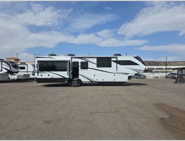 Sleeps 6 Slides 4 Length 42 ft 11 in Ext Width 8 ft 5 in Ext Height 12 ft 9 in Exterior Color Standard Graphics or Aurora, Midnight, Pearl Full-Body Paint Options Hitch Weight 2800 lbs GVWR 19000 lbs Dry Weight 15400 lbs Fresh Water Capacity 83 gals Grey Water Capacity 106 gals Black Water Capacity 53 gals Tire Size ST215/75R 17.5 LRH Furnace BTU 35000 btu Number Of Bunks 1 Available Beds Queen Refrigerator Type Stainless Steel Refrigerator Size 20 cu ft Cooktop Burners 3 Shower Size 48" x 30" Number of Awnings 2 Axle Weight 8000 lbs LP Tank Capacity 30 lbs. Water Heater Type Tankless On Demand AC BTU 15000 btu TV Info LR LED Telescoping Smart TV, Bunkroom 50" TV Awning Info 11' and 18' Power w/Integrated LED Lighting Axle Count 2 Washer/Dryer Available Yes Number of LP Tanks 2 Shower Type Shower w/Seat Electrical Service 50 amp Similar Fifth Wheel Floorplans