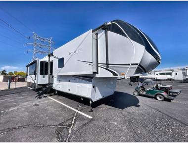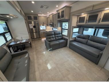 Sleeps 6 Slides 4 Length 41 ft 8 in Ext Width 8 ft 5 in Ext Height 13 ft 5 in Int Height 8 ft 1 in Exterior Color Standard Graphics or Aurora, Midnight, Pearl Full-Body Paint Options Hitch Weight 3290 lbs GVWR 19000 lbs Dry Weight 15494 lbs Fresh Water Capacity 81 gals Grey Water Capacity 106 gals Black Water Capacity 106 gals Tire Size ST215/75R 17.5 LRH Furnace BTU 35000 btu Available Beds Queen Refrigerator Type 12V Refrigerator Size 20 cu ft Cooktop Burners 4 Shower Size 48" x 30" Number of Awnings 2 Axle Weight 8000 lbs LP Tank Capacity 30 lbs. Water Heater Type Tankless On Demand AC BTU 15000 btu TV Info LR LED Smart TV Awning Info 14' 5" & 20' Power w/Integrated LED Lighting Axle Count 2 Washer/Dryer Available Yes Number of LP Tanks 2 Shower Type Shower w/Seat Electrical Service 50 amp Similar Fifth Wheel Floorplans