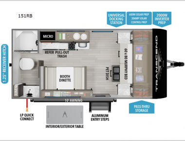 Sleeps 3 Length 19 ft 8 in Ext Width 8 ft Ext Height 10 ft 3 in Int Height 6 ft 6 in Hitch Weight 490 lbs GVWR 4420 lbs Dry Weight 3600 lbs Fresh Water Capacity 37 gals Grey Water Capacity 37 gals Black Water Capacity 37 gals Tire Size ST215/75R14LRD Furnace BTU 20000 btu Available Beds Queen Murphy Bed Refrigerator Type Glass Front 12V Refrigerator Size 3.3 cu ft Cooktop Burners 2 Shower Size 24" x 32" Number of Awnings 1 LP Tank Capacity 40 Water Heater Capacity 6 gal Water Heater Type Gas/Electric AC BTU 13500 btu Awning Info 10' Power w/Fusion Light Axle Count 1 Number of LP Tanks 1 Shower Type Walk-In Shower Similar Travel Trailer Floorplans