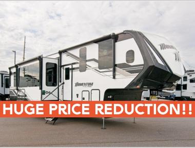 With the 2026 Grand Design Momentum 414M, your adventures are about to go beyond the ordinary! 14 ft garage, spacious kitchen pantry, and queen bed slide out!