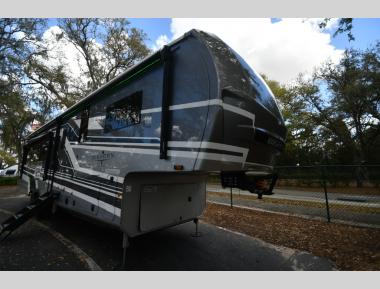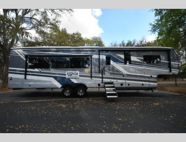 Sleeps 4 Slides 4 Length 42 ft 6 in Ext Width 8 ft 6 in Ext Height 13 ft 3 in Int Height 8 ft 6 in Interior Color Stonewall Gray Exterior Color Opt. Full Body Paint (Ash, Shadow, Glacier Blue) Hitch Weight 2970 lbs GVWR 17995 lbs Dry Weight 15275 lbs Cargo Capacity 2720 lbs Fresh Water Capacity 75 gals Grey Water Capacity 137 gals Black Water Capacity 50 gals Tire Size 215/75R17.5H Furnace BTU 40000 btu Available Beds King Refrigerator Type Residential Refrigerator Size 21 cu ft Convection Cooking Yes Cooktop Burners 4 Shower Size 36" x 48" Number of Awnings 2 Axle Weight 8000 lbs LP Tank Capacity 90 Lbs. Water Heater Type On Demand Tankless AC BTU 30000 btu TV Info LR 4K Smart LED HDTV, BR 32" 4K Smart TV Awning Info 15' & 17' Electric w/ Integrated RGB LED Lights Axle Count 2 Washer/Dryer Available Yes Shower Type Walk-In Shower Solar Wattage 400 watts Similar Fifth Wheel Floorplans