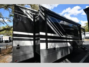 Starting from the back, this impressive 39RK features a rear kitchen designed in a convenient U-shape for easy accessibility and efficient meal prep. The kitchen is fully equipped with plenty of overhead cabinets, a convection microwave with an air fryer, a 24" range, and a pull-out pantry, perfect for the chef on the trip to cook in comfort. Across the kitchen, the large slide-out houses a 21-cu. ft. refrigerator and a second pantry with shelves, providing even more space to store groceries, snacks, and coffee essentials. The nearby desk/coffee bar and roll-out table create an inviting area to enjoy meals or unwind with a cup of coffee. The living area offers a spacious 100" L-shaped sofa and a theater seat facing the TV and fireplace, making it an ideal spot for relaxing or hosting movie nights. Moving forward, you’ll find a convenient half bathroom with linen shelves for added storage and accessibility. At the front, the private bedroom features a 72" x 80" king bed in a slide-out with a dresser across for ample storage. Finally, the full bathroom at the very front includes a 30" x 61" shower with a seat for comfort, a large sink, and a walk-in closet that provides generous space for all your clothing and gear.