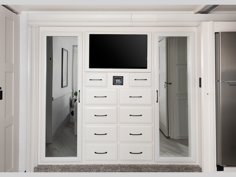 Sleeps 6 Slides 2 Length 35 ft 9 in Ext Width 8 ft 4 in Ext Height 12 ft 10 in Int Height 6 ft 10 in Interior Color Cumberland, Sentinel, Solstice Exterior Color Magnum, Matterhorn, Maverick, Motion, Obsidian Hitch Weight 8000 lbs GVWR 26000 lbs Fresh Water Capacity 100 gals Grey Water Capacity 50 gals Black Water Capacity 50 gals Generator 5.5W Fuel Type Gasoline Engine 7.3L V8 Chassis Ford F-53 Horsepower 335 hp Fuel Capacity 80 gals Wheelbase 242 in Number Of Bunks 2 Available Beds RV Queen Torque 468 ft-lb Refrigerator Type Residential Convection Cooking Yes Cooktop Burners 3 Shower Size 34" x 22" Axle Weight Front 9000 lbs Axle Weight Rear 17500 lbs Basement Storage 134 cu. ft. TV Info LR LED TV, BR LED TV, Ext. LED TV Awning Info 20' Washer/Dryer Available Yes Gross Combined Weight 30000 lbs Shower Type Standard Electrical Service 50 amp Similar Floorplans