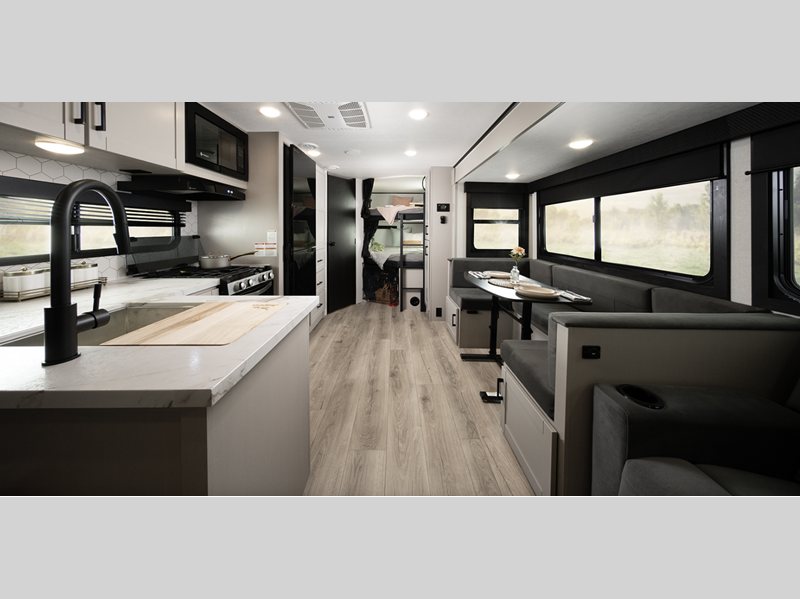 Sleeps 7 Slides 1 Length 29 ft 8 in Ext Width 8 ft Ext Height 10 ft 8 in Int Height 6 ft 6 in Interior Color Dune Gray Hitch Weight 635 lbs GVWR 7600 lbs Dry Weight 6015 lbs Cargo Capacity 1585 lbs Fresh Water Capacity 55 gals Grey Water Capacity 76 gals Black Water Capacity 38 gals Tire Size ST205/75R14D Furnace BTU 35000 btu Number Of Bunks 2 Available Beds Queen Refrigerator Type 12V Refrigerator Size 11 cu ft Cooktop Burners 3 Shower Size 30" x 36" Number of Awnings 1 LP Tank Capacity 20 lbs. Water Heater Type On Demand Tankless AC BTU 13500 btu TV Info LED Smart TV Awning Info 21' Max-Length Power w/LED Light Axle Count 2 Number of LP Tanks 2 Shower Type Standard Electrical Service 30 amp Solar Wattage 200 watts Similar Floorplans