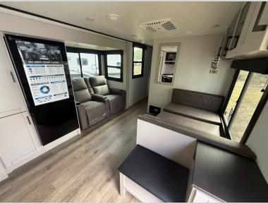 The chef of your group will love this rear kitchen trailer with generous counter space to prep meals! Your crew can dine at the booth dinette or under the 20' power awning with LED lights, and when you're ready to relax, the theater seat will provide comfort. There is also a storage cabinet with a bench that will allow you to utilize this space however you need it! The spacious full bath will let you clean up each day, and the front private bedroom is sure to make you feel at home. Here, you'll find a queen bed, three wardrobes, plus one of the dual entry doors for added convenience!