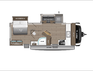 Step inside this spacious travel trailer through the front entry and you find the front kitchen that spans the width of the unit, providing plenty of counter space for meal prep. The kitchen is fully equipped with a stainless-steel sink, a decorative backsplash, a 3-burner cooktop, and an 11-cu. ft. 12V refrigerator, perfect for storing all your groceries. Overhead shelves offer convenient storage, and a pantry adds extra space for essentials. Next to the kitchen, you’ll find 60" theater seating, ideal for enjoying meals or watching your favorite shows on the LED Smart TV. As you move down the hall, you’ll come to a full bathroom featuring a radius shower and two entry doors for easy access. At the rear of the trailer, the comfortable bedroom features a 60" x 80" Queen bed, a sliding mirror door closet for added storage, and a second entry door to the exterior.