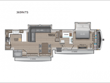 You can't go wrong when camping in this triple slide out fifth wheel! Once you've arrived at your destination and unloaded the pass-through storage, you can make lunch in the rear kitchen with generous counter space. There are also two pantries, one being a pull-out, plus a convenient pull-out butcher block so you can chop fresh veggies! You can enjoy your meal at the roll-top dinette with chairs, and if you need to get some work done, the desk/coffee bar will provide a space for your laptop. An L-shaped sofa and theater seat in the main living area will create an inviting space, plus there is a 65" TV and a mantle with a fireplace just like at home! Freshen up in the full bath at the end of the day, then head to the front private bedroom for a great night's rest on the king bed slide out. There is a closet with drawers and a hamper below, a chest with a TV, plus washer and dryer prep for the option to add these appliances; how convenient!