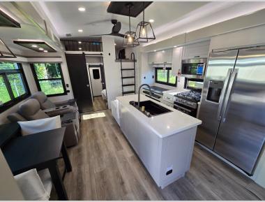 With two bedrooms plus a loft, there aren't many fifth wheels that can sleep as many people in as much comfort as this Jayco North Point! Up front is a private bedroom suite with a king bed and next to the bedroom is a full bathroom, while towards the rear you'll find a second bedroom with a queen bed. This bedroom also has an adjacent bathroom, conveniently all the way to the rear so it has its own entry door to the outside. There's also a loft with three bed mats which will be perfect for kids. In the center of it all you'll find a great living space, with a fully equipped kitchen and plenty of room for everyone to hang out. Relax in the theater seats across from the entertainment center, which features a 50" Smart LED HDTV and a fireplace for cozy evenings.