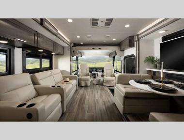 The Jayco Precept is a gas class A motorhome that can sleep six to eight people depending on the floorplan. This motorhome is ideal for long road trips as it includes similar amenities to your home or staying in a hotel while on the road.