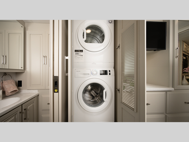 Each place you choose to camp will feel like home since you can bring excellent amenities with you, like the exterior entertainment center with an LED TV, the Winegard in-motion satellite dish, and the walk-around king-size bed. You'll also have some high-quality tech features to use, like the Aqua-Hot 250D hydronic water and heating system, the 8,000W diesel generator with auto-gen start, and the 200W solar panel with a dual controller!